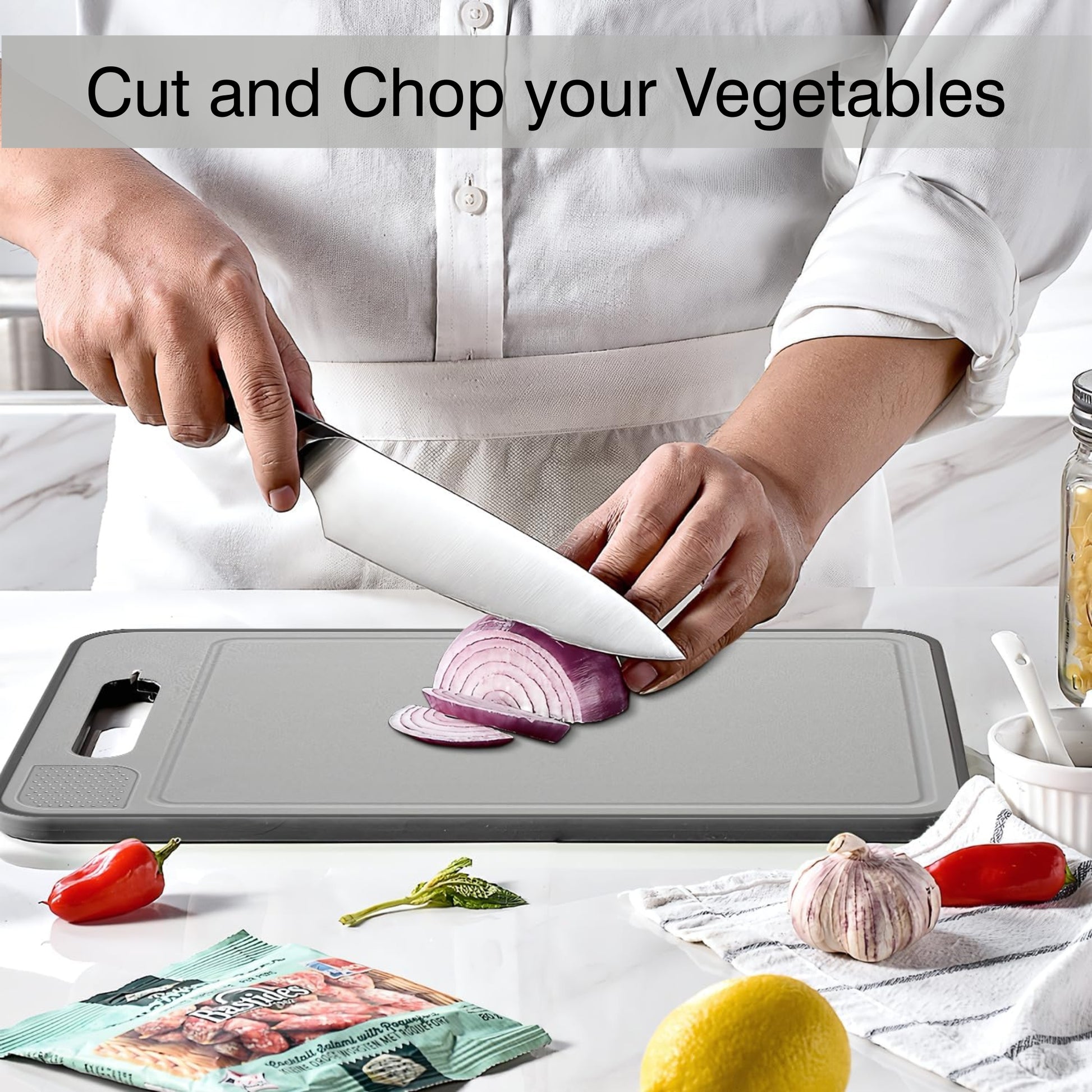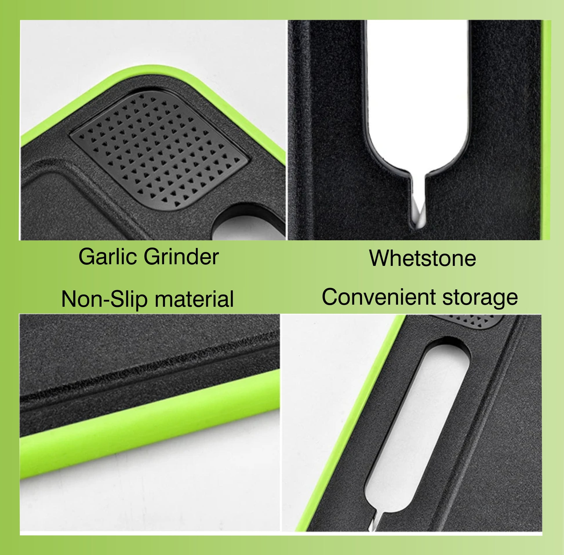 Additional features include an integrated knife sharpener and garlic grinder, making this cutting board an all-in-one tool that simplifies your kitchen tasks. Whether slicing, dicing, or grinding, this versatile board is built to handle all your cooking needs efficiently.
