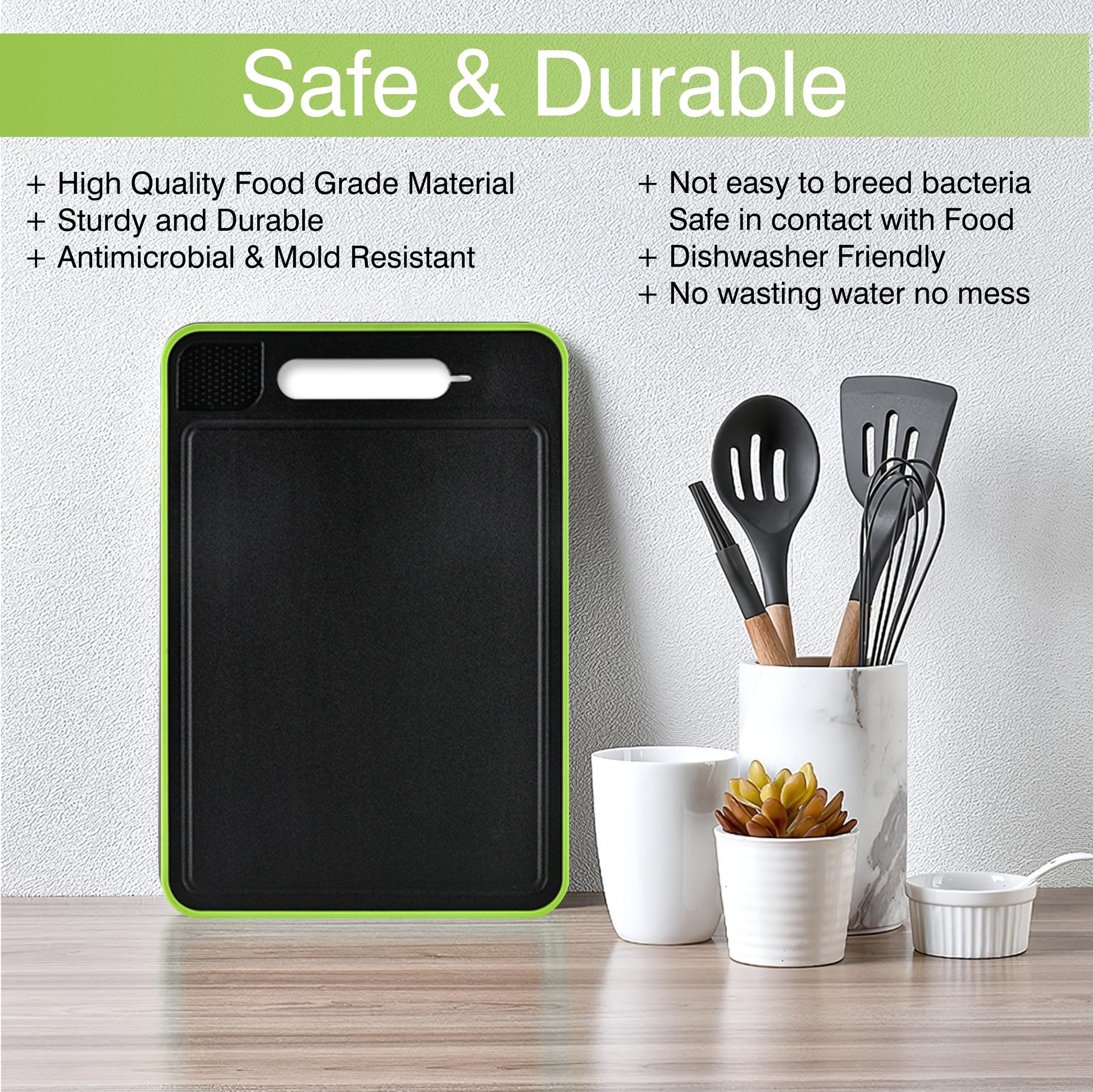 + Non-slip silicone edges and deep juice groove for safe and mess-free chopping